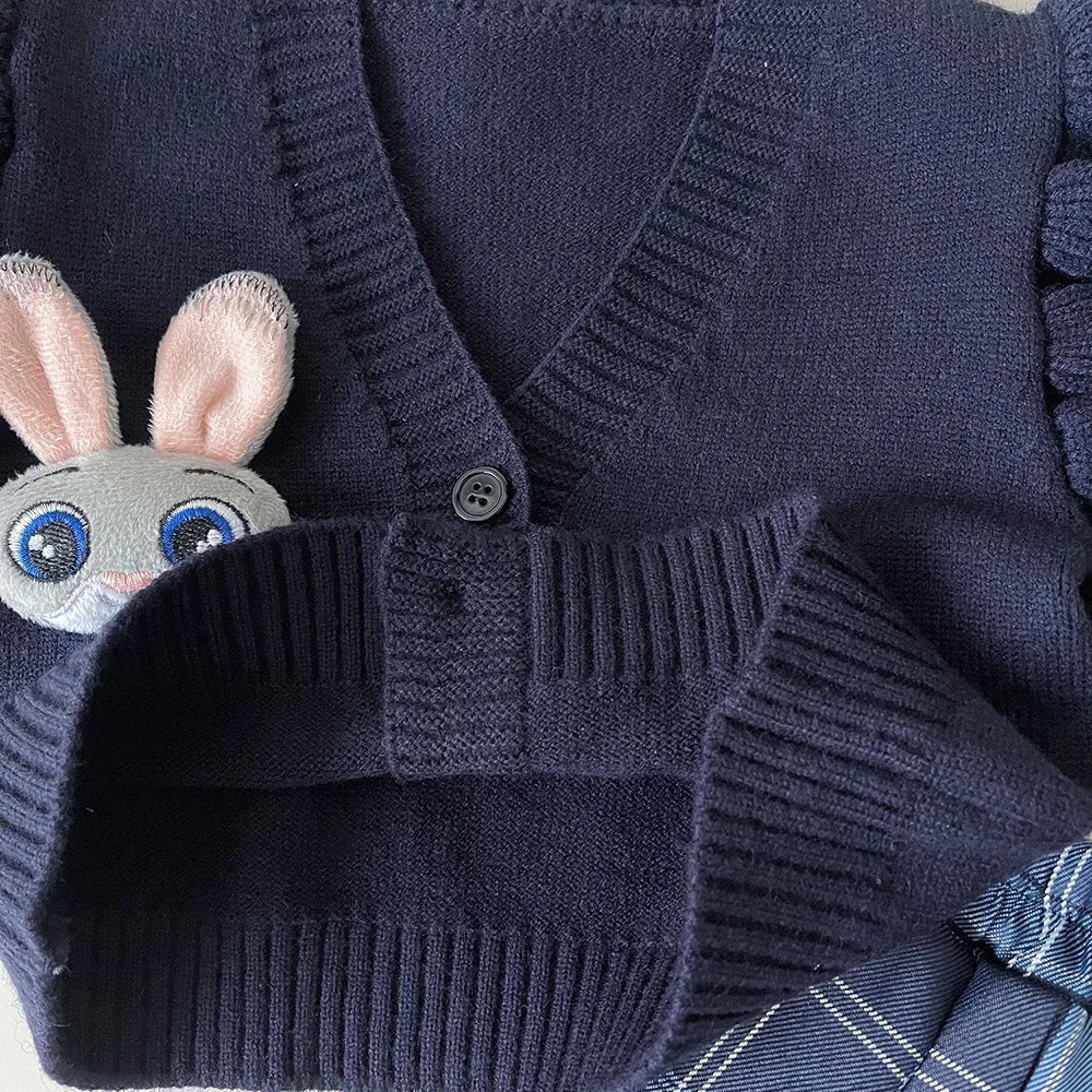 This girls' set features a knitted Judy Rabbit vest with a turn-down collar and a plaid skirt with an elastic waist. Made from cotton, it offers a comfortable fit with a single-breasted closure and full petal sleeves. The outfit combines style and practicality without harmful chemicals, making it an excellent choice for young children.
