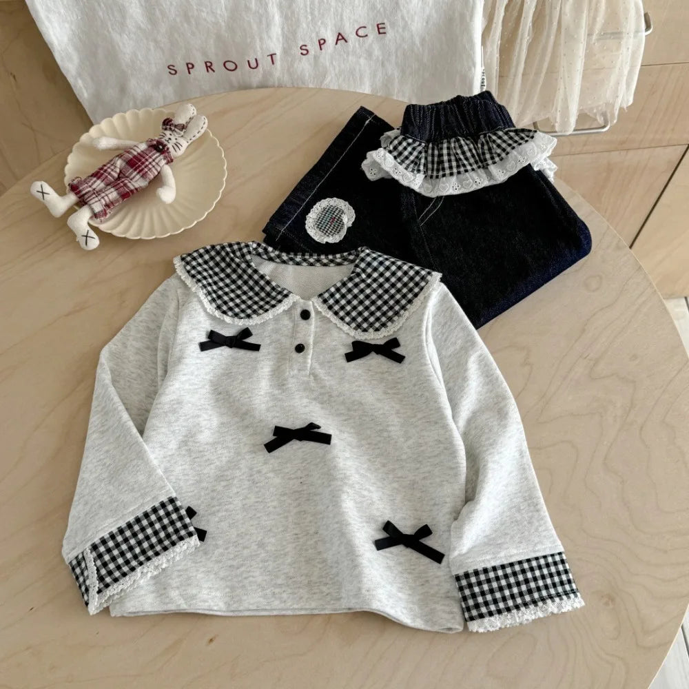 Collared Checkered Bow Top & Lace Wide Leg Pants Set