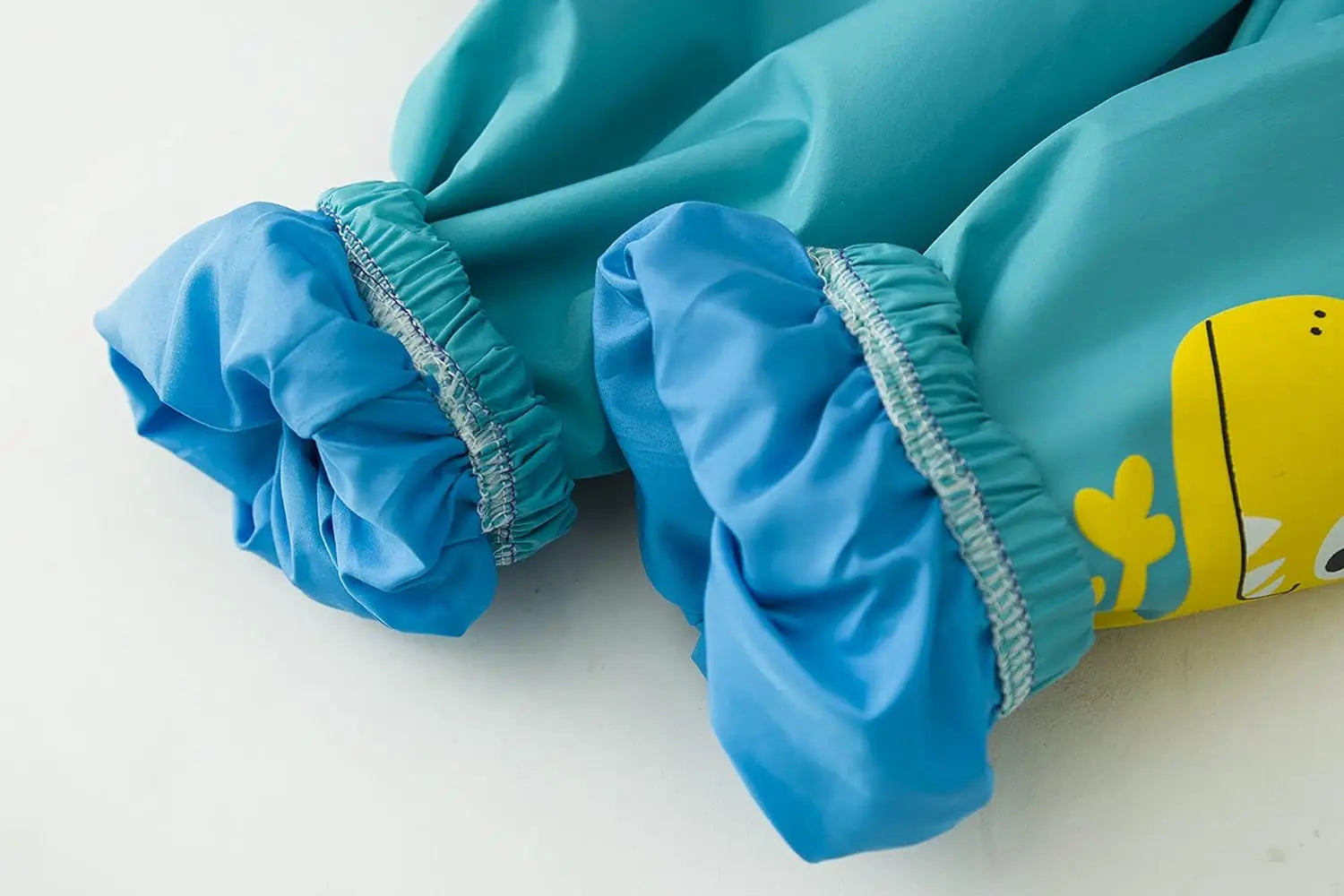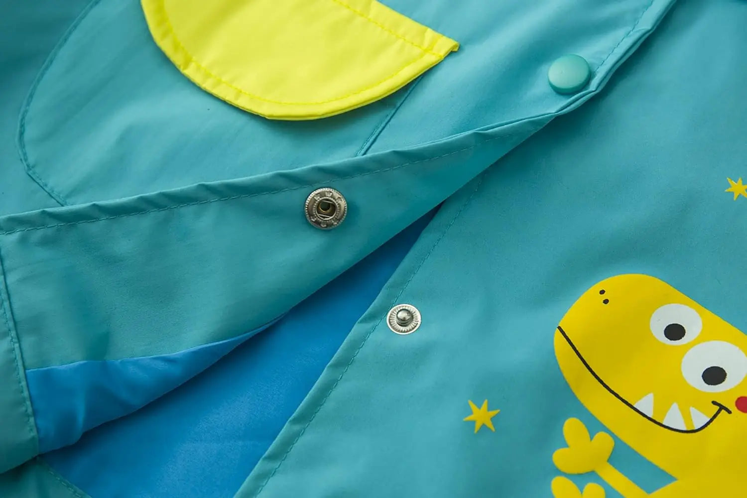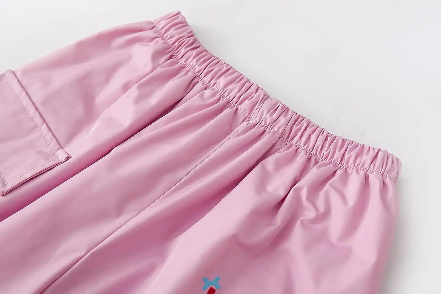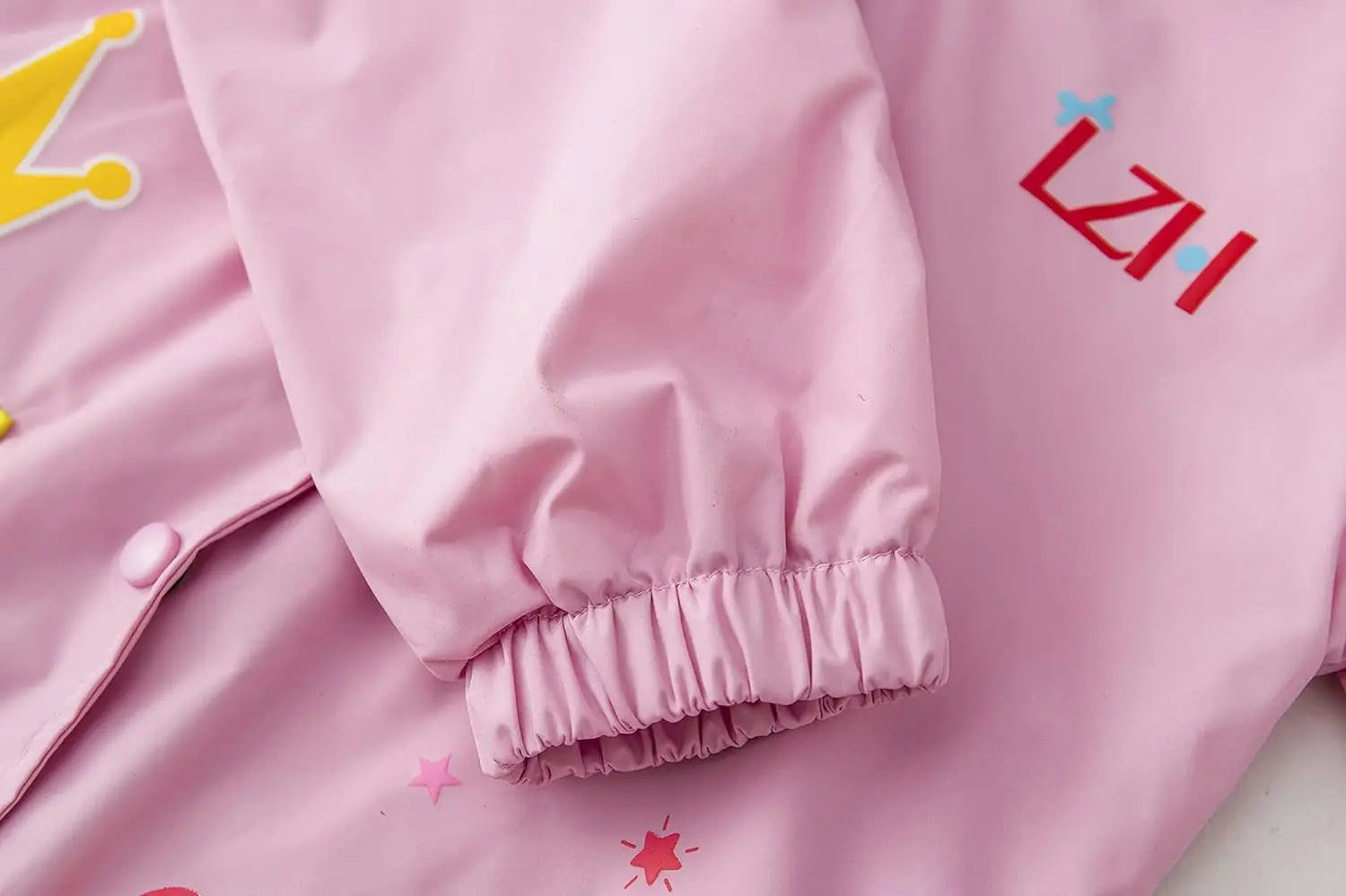 This waterproof autumn and winter rain suit for toddlers features a hooded coat and matching pants made from polyester and viscose. Designed for girls & boys, it offers a comfortable, true-to-size fit with a single-breasted closure. The thick, cartoon-patterned set provides reliable protection against wet weather while allowing active movement. Free from harmful chemicals, it combines durability and safety for everyday outdoor wear.