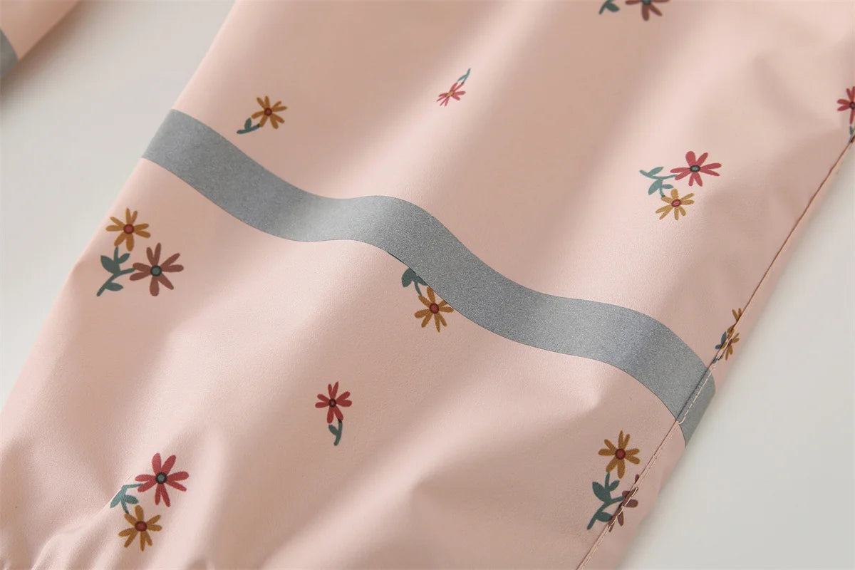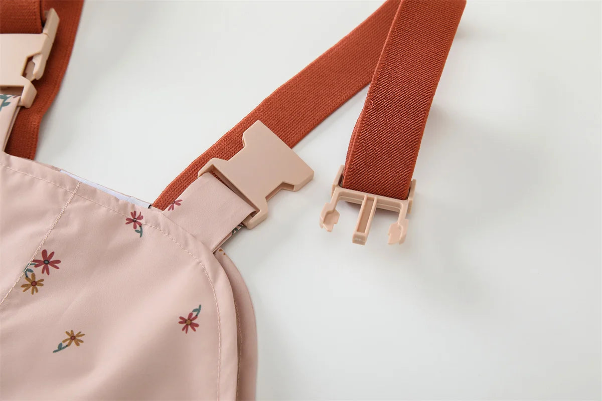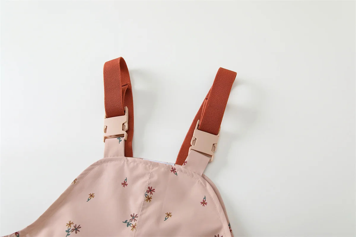 Children Waterproof Rain Pants, offering a loose, true-to-size fit suitable for both boys and girls. Made from a cotton, polyester, and spandex blend, these overalls provide comfort and durability. Featuring a button fly closure and a playful cartoon pattern, they are ideal for all seasons. The pants are waterproof, protecting children during rainy weather while maintaining a stylish European and American look. Choose the size based on your child's height for the best fit.